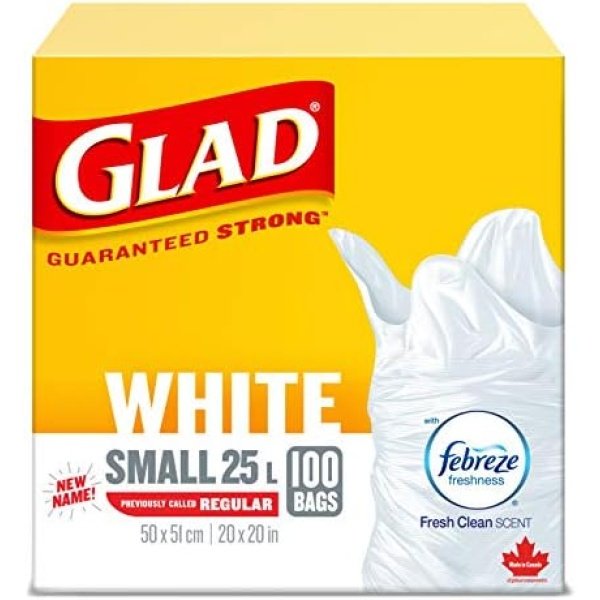 Glad White Garbage Bags – Small 25 Litres – Febreze Fresh Clean Scent, 100 Trash