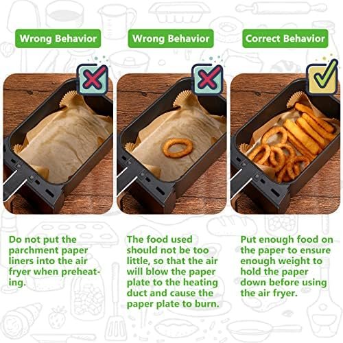 ⚠️【Cautions】 Do not put empty parchment paper liners when preheating, and do not use too little food to avoid disposable paper liners that cannot be pressed because of their light weight, and hot air blowing the paper liners into the heat pipe causing the paper pan to burn.