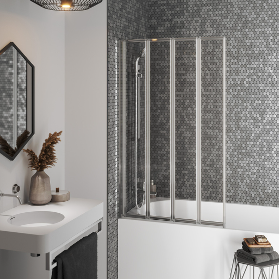 The folding four-door design means you can retract the screen between uses, opening up your bath area. When it’s time to shower, just pull it back to prevent any splashes from making the bathroom floor wet.