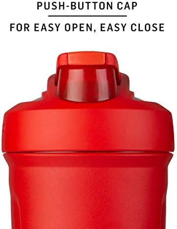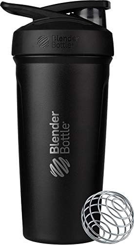The BlenderBottle Strada Stainless Steel push-button insulated protein shaker provides sleek style and ultimate ease. The bottle’s spill-proof locking lid opens and closes with the touch of a button. A flexible, ergonomic carry loop provides a comfortable hold. The patented mixing system utilizes the BlenderBall wire whisk to mix even the most stubborn protein powder, and a rounded base ensures a smooth blend. Double-wall insulated stainless steel keeps drinks cold for up to 24 hours. Measurement markings on the inside of the bottle add to the ease of creating perfect protein shakes. Leak proof; top-rack dishwasher safe; BPA and phthalate free..