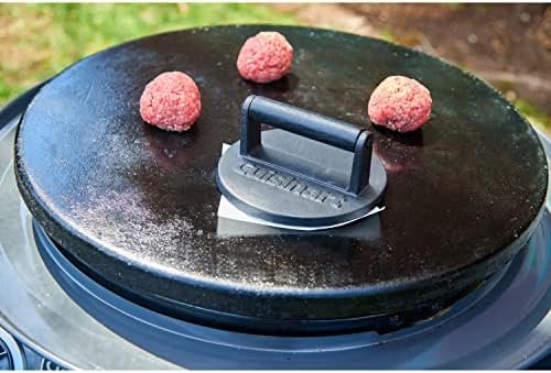 Lock in the juicy flavors & create a caramelized crust with the Cuisinart cast iron Smashed Burger Press! Place a loosely shaped Ball of meat on your oiled Skillet or griddle (you can add a little butter for that extra flavor), then use the heavy Smashed Burger Press & press down until you touch The cooking surface. The edge-lip of the burger Press keeps all the flavorful juices locked into place. The patty will have a nice caramelized layer on the bottom, make sure you scrape under the patty prior to flipping it, to make sure you keep that crust in tack! Classic smashed burgers are topped with Mayo & American cheese, but with this burger Press you can make your own creations at home! Change up Your normal burgers with the Cuisinart cast iron Smashed Burger Press, The thinner patty will add a flavorful crust that will amaze your family & friends.