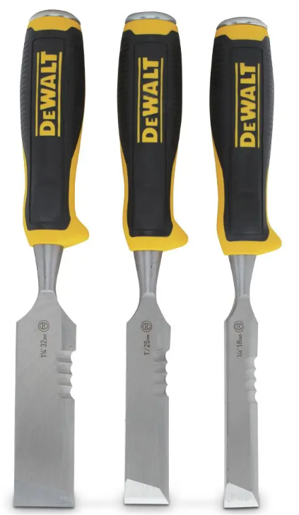 The 3 pc Wood Chisel Set comes with a 3/4inch chisel, 1inch chisel, and 1-14inch chisel for different uses.