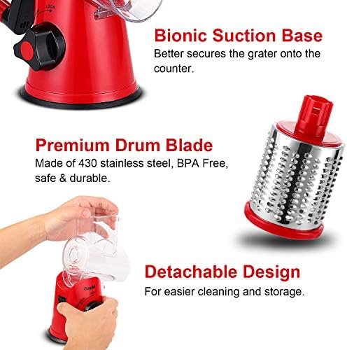 ✔Make the Cutting Faster – Unique rotating drum cutting design, which makes the drum grater cut the ingredients 12x faster than other cheese shredders, let you take less time to get prep food with effortless rotating.
