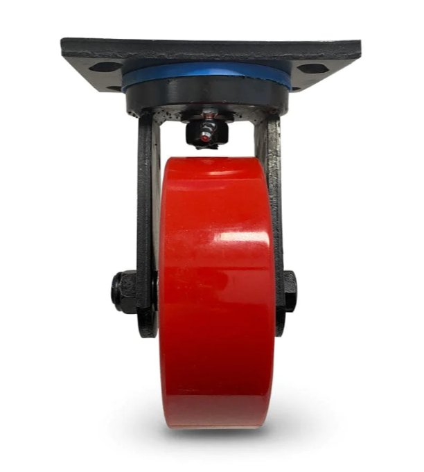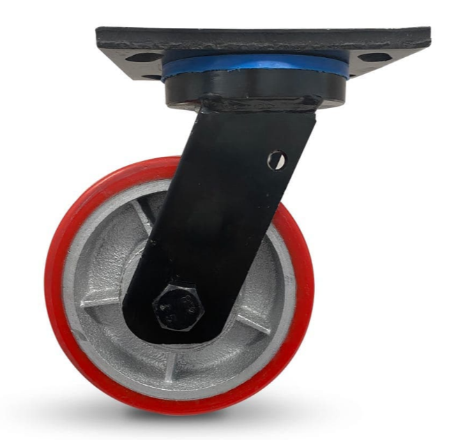 EXTREME HEAVY DUTY fabricated steel componentry with black zinc finish for corrosion resistance. Cast iron double ball bearing core centred wheel with moulded polyurethane outer. Suitable for mobile platforms, heavy machinery, warehouse equipment, transport and logistics applications that require the shock protection of the moulded polyurethane outer and a towable option.