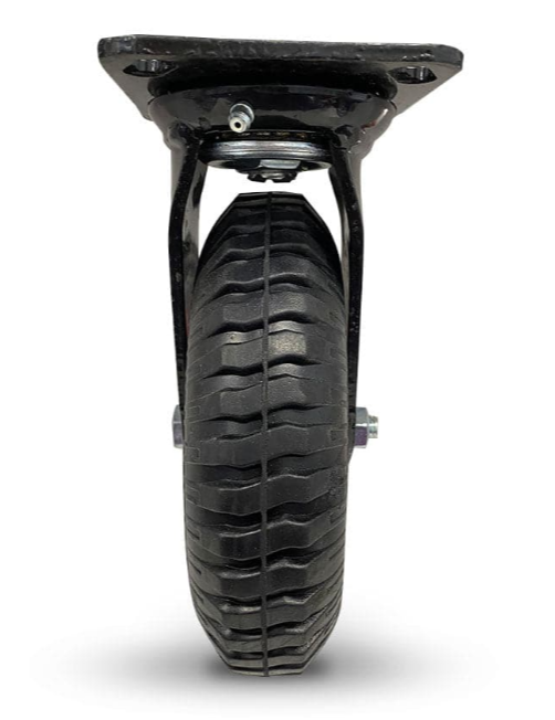 Black baked enamel finished fabricated steel componentry with steel core centred, solid rubber outer wheel with double ball bearings.