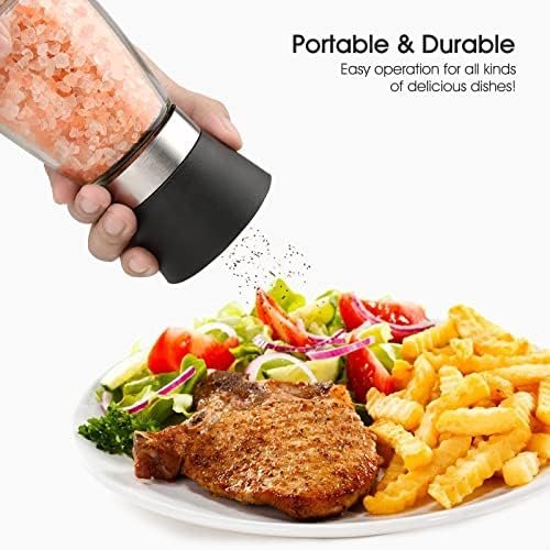 🥙【Easy To Refill】Salt and Pepper Mills are 5.1” tall and each salt shaker and pepper shaker will hold up to 3/4 cup or 6 oz of the salt, pepper or the spice of your choice. Just unscrew the grinder from the bottle to refill.Manially cranked = No Batteries = Environmentally Friendly salt and pepper grinder sets. Effortlessly twist with your hand grind fresh ingredients!