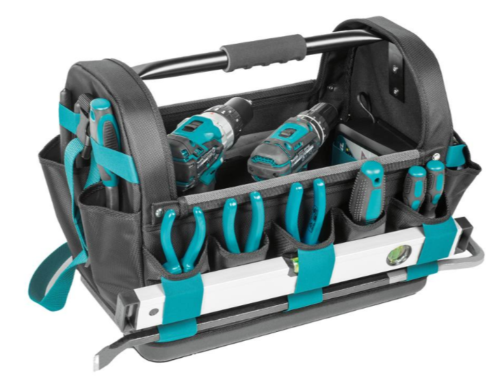 The open tool bag has nine outer compartments in different sizes, eight elastic bands for hand tools and a large open compartment in the middle of the pocket for machines. The floor is waterproof and reinforced. With partially padded metal handle. Including strap belt made of strap belt system.