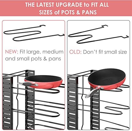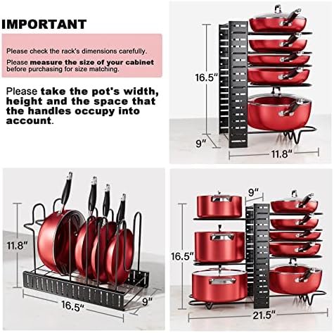 Large Storage Capacity and Compact SizeOur pot and pan organizer has 8 tiers; allowing you to store 8 and more stacked pots and pans; The compact design saves you a lot of space in your kitchen cabinets pantries and on your countertops; Great pots and pans organizer under cabinet or in cabinet