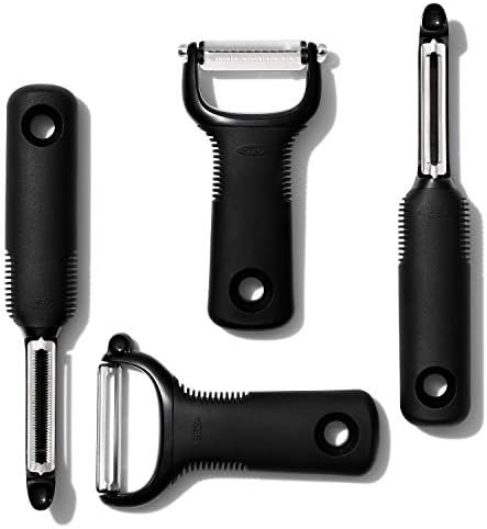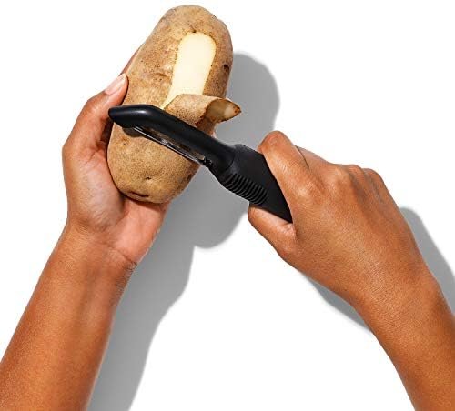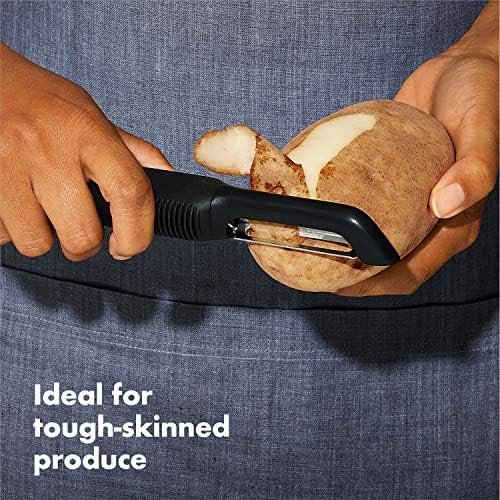 The OXO Good Grips Swivel Peeler is perfect for prepping tough-skinned fruits and vegetables. Twin stainless steel blades flex to remove large swaths of skin with each stroke. The comfortable, oversized handle was designed for fast, repetitive use and won’t slip, even when wet. A durable, built-in eye remover carves out blemishes without ruining your produce. The Peeler is dishwasher safe and includes a large in-handle hole for simple storage.
