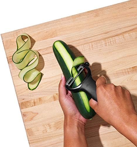 “Y” Peeler. 5.75″/14.5cm, black, stainless steel blade. Includes a built-in eyer and features a sharp stainless steel blade that glides through even the toughest fruit and vegetable skins with ease. The soft, comfortable handle cushions your hand as you peel, and is non-slip, even when your hands are wet. Dishwasher safe.
