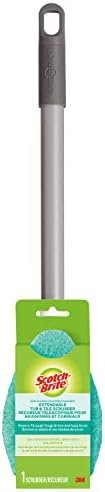 No scratch cleaning head on telescopic pole extends to hard to reach places of the shower. Removes soap scum without scratching. Replaceable cleaning head.