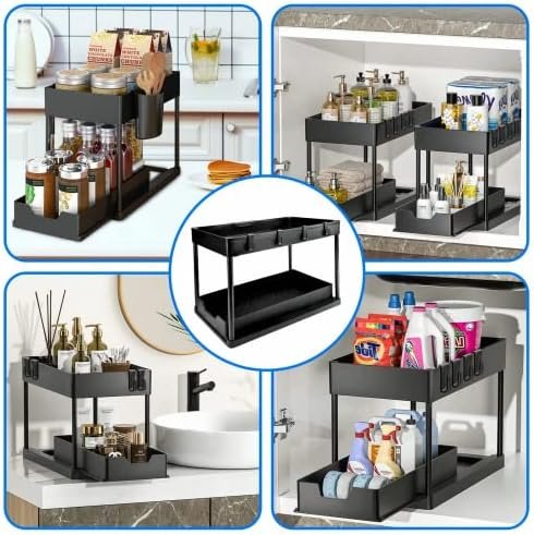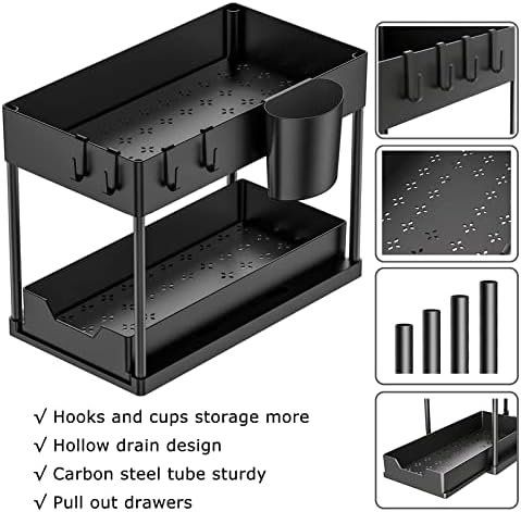 2 SET MUCH MORE ACCESSORIES – the packing include 2 set under sink organizer kitchen, each set have 4 hooks and 1 cups,enough to hold more